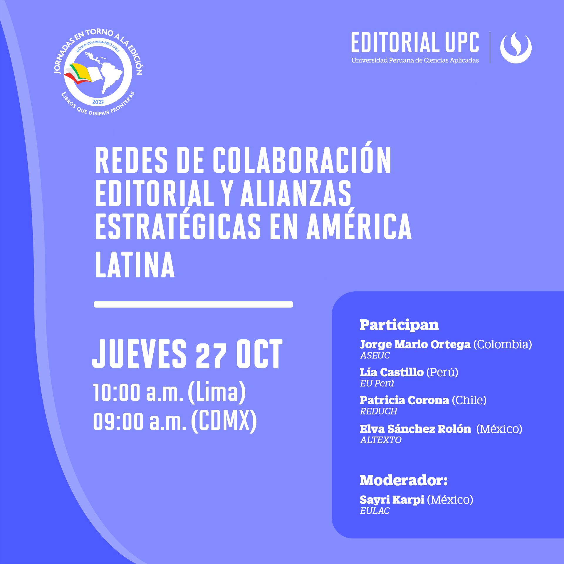 | Jueves 27 oct | 9:00 a. m. | Mesa: «Redes de colaboración editorial y alianzas estratégicas en América» |